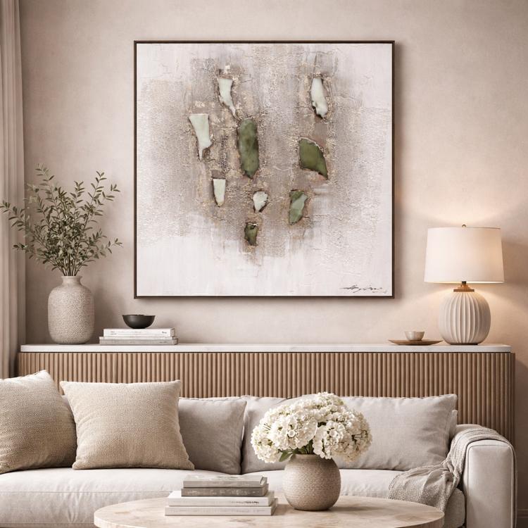 Lucrarea imbina armonios texturi naturale si accente moderne, fiind potrivita pentru livinguri, birouri sau spatii comerciale premium.