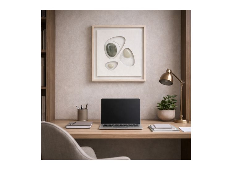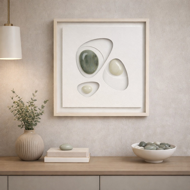 Lucrarea imbina armonios texturi naturale si accente moderne, fiind potrivita pentru livinguri, birouri sau spatii comerciale premium.
