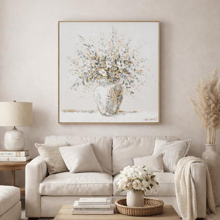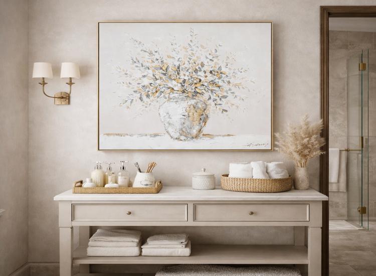 Lucrarea imbina armonios texturi naturale si accente moderne, fiind potrivita pentru livinguri, birouri sau spatii comerciale premium.