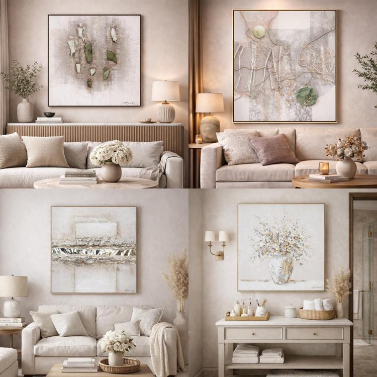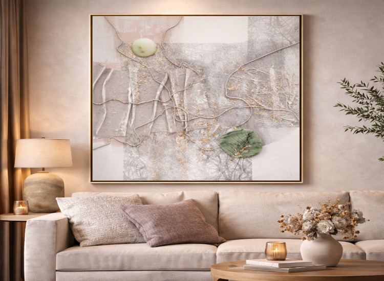 Lucrarea imbina armonios texturi naturale si accente moderne, fiind potrivita pentru livinguri, birouri sau spatii comerciale premium.